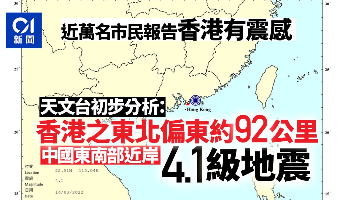 香港地震 天文台 中國東南部近岸4 1級地震震央離港92公里
